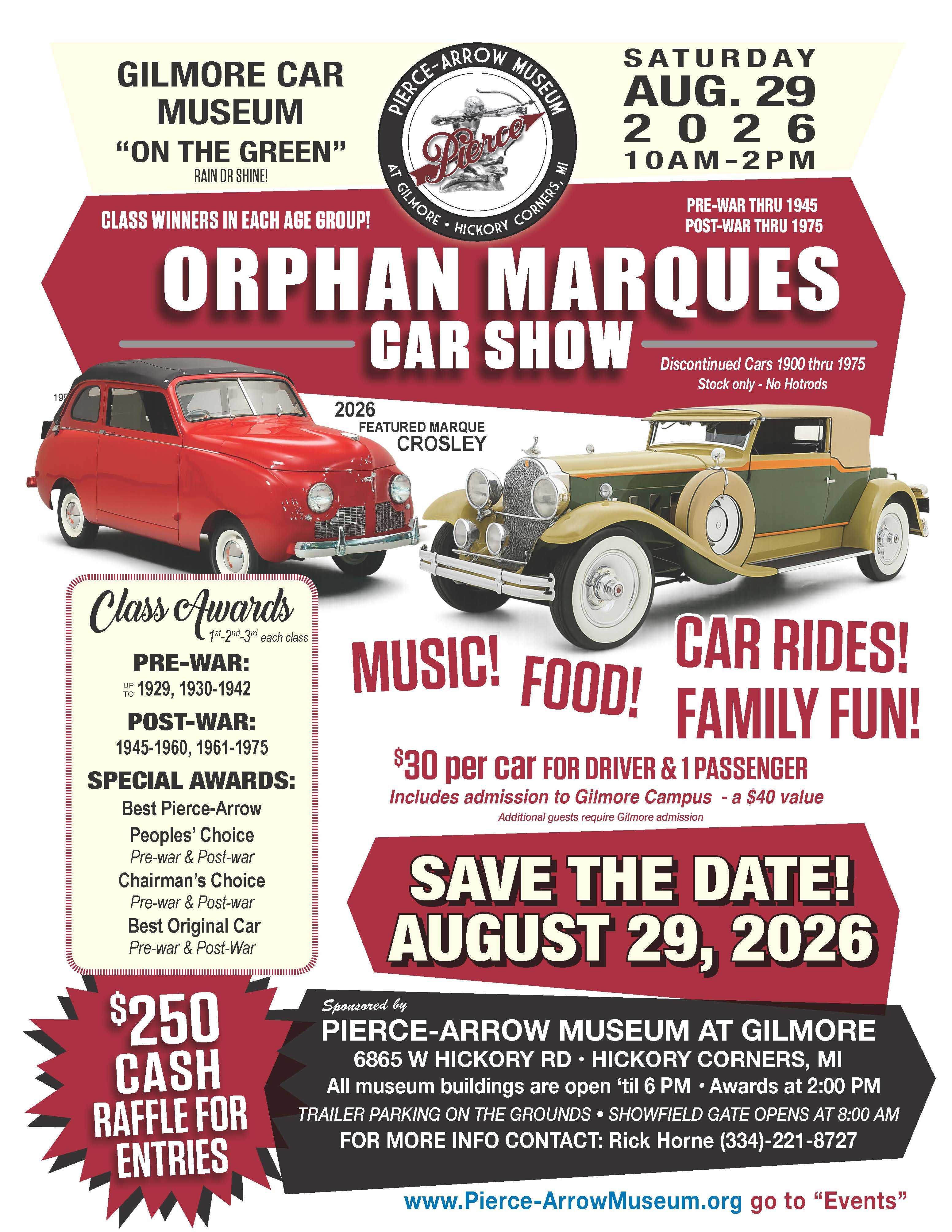 Want to bring your car? Register online now! $30 registration enters your pre-war orphan car, driver and guest to the Gilmore campus. Day of event registration is $35.